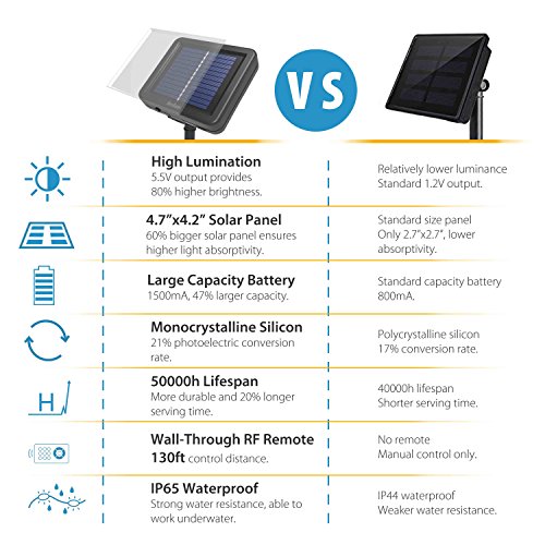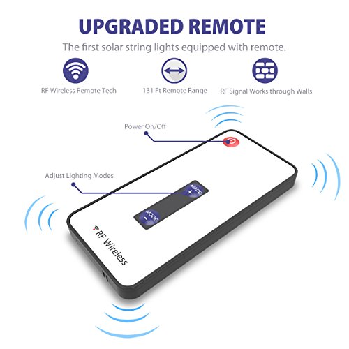 - Exclusive RF Remote: First brand to make RF remote for solar string lights. The maximum control distance of this remote is 130ft and you can even use it to control the lights through wall. Just stay safe and sound indoors with a simple touch to control your decorative string lights in the yard. Awesome decorative lights for outdoor embellishment.