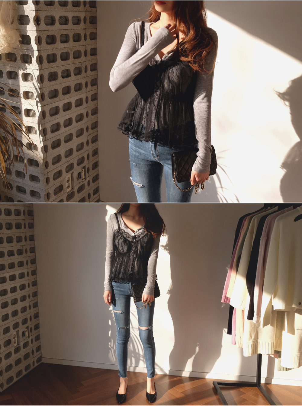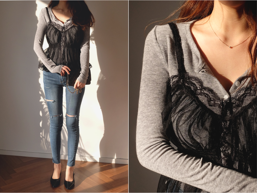 시스루 디자인에 레이스 네크라인으로 페미닌한 무드 가득-