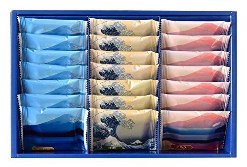 サクッとした食感のラングドシャ生地でチョコクリームをサンドしました。3つの味(コーヒー、ミルク、抹茶)を詰め合わせ、パッケージには勇壮な富士山と桜をデザインしました。中のお菓子は、朝夕の富士山、葛飾北斎の「神奈川沖浪裏」をデザインした個包装になっています。