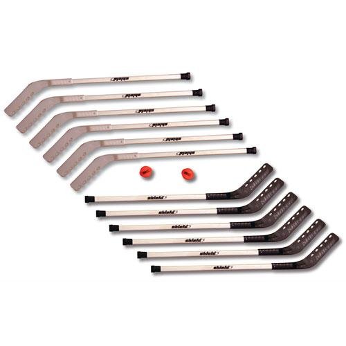 Product Description This hockey set is made specifically for for P.E. classes and park and rec. departments! These hockey sets are designed exclusively for use on asphalt and concrete. Most floor hockey sets are made for use indoors and quickly wear out when used on the hard playground. These sets feature extra thick outdoor plastic blades that will last for years. Each set includes 12 sticks - (6 White blades / 6 Black blades), 2 speed control balls and 1 instruction booklet. Blades are not to be used on gymnasium floors.