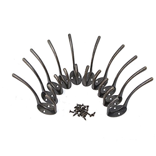 - 【CONVENIENT DESIGN】With 2 holes, these hooks are very easy to install. Each hook is reinforced with 2 screws, and they can work with each other well to keep your items. The edge is so smooth that will not damage your clothes or any item you hang on. They are in vintage bronze color with classic style, which can show your unique taste to your friends or neighbours.the unused screws are a gift to you.