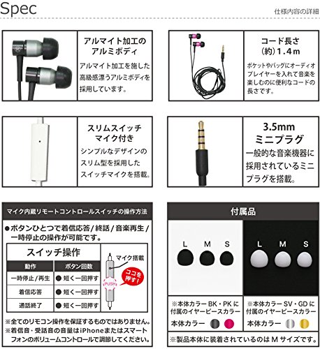 -. Feature : コード長: 1.4m / 対応機器: 3.5φイヤホンジャック対応の各種スマートフォン(含、iPhone) / イヤホンヘッドの大きさ:H20xW22xD7mm / 本体重量:14g / 付属品: イヤーピース3サイズ(S/M/L)各2