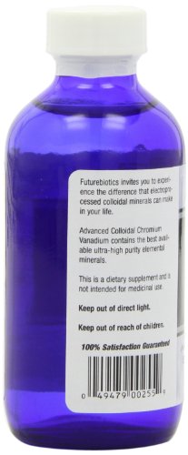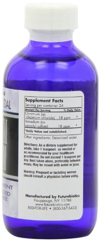 Futurebiotics Advanced Colloidal Chromium Vanadium is a high-quality, chemical-free supplement that consists of ultra-fine, microscopic chromium and vanadium particles in exacting, balanced combination and suspended in purified water. The colloidal form is one of the most bioavailable forms of supplementation and is the perfect choice for individuals who dislike or have difficulty swallowing pills or capsules. Advanced Colloidal Chromium Vanadium is a very effective way of supplementing the body with these important nutrients that are used for many physiological functions including proper carbohydrate metabolism.Since our early beginning in 1984, Futurebiotics has been committed to “Creating a Healthier Future* by helping our customers lead healthier lives through better nutrition. After more than 30 years, that is still our commitment. This comprehensive and meticulous commitment to product integrity guarantees that you can be absolutely confident that when you choose a Futurebiotics product for yourself and your family, you are choosing the very best nature, and Futurebiotics, has to offerFeature