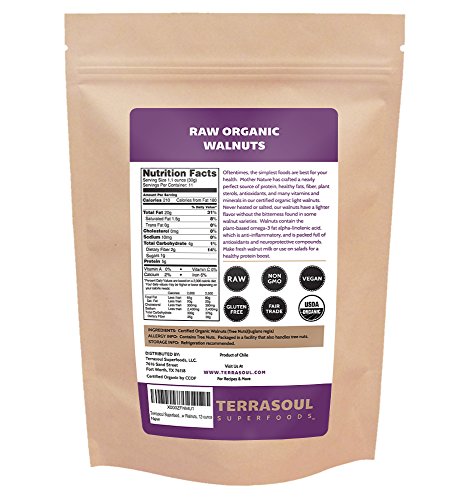 - Feature : Terrasoul Superfoods Organic Raw Walnuts, 12 Ounces / 100% Certified Organic, Non-GMO, Raw, Gluten-Free, Vegan / Our raw walnuts are a Chandler variety with light halves and pieces and have a wonderfully rich nutty flavor, without the bitter aftertaste found in walnuts of lesser quality. / Our walnuts are imported from Chile and are Perfect for making your own raw, organic nut milks without any additives / Terrasoul Superfoods sources the freshest and highest quality superfoods from all over the planet. Our mission is to make these amazing, healthy foods available to you at the lowest prices possible while paying our growers and employees fair wages. 100% Money-Back Satisfaction Guarantee - We stand behind our products and offer a 30-day money back guarantee.