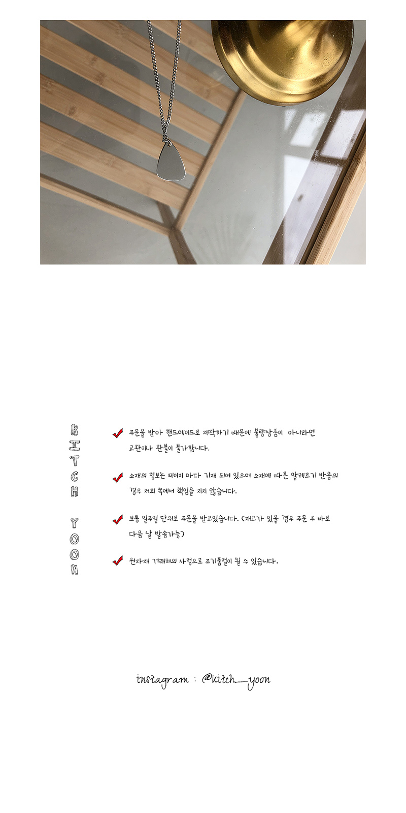 체인은 써지컬 스틸소재이지만 펜던트와 연결 부자재인 O링은 신주소재이므로, 이 점 유의해주시고 신중하게 구매해주세요.