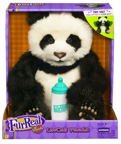 This adorable black and white panda bear loves to be held and makes real bear sounds to show his delight.;Give him a bear hug and heÃÂ'Ã'¿ll give a hug right back!;Luv Cub Panda loves to play peek-a-boo and will move his arms up to his face to cover his eyes.;Luv Cub Panda comes complete with a bottle that he loves to slurp up, but be careful, if you feed him too much, he'll get the hiccups!;Requires three C batteries, included.Feature