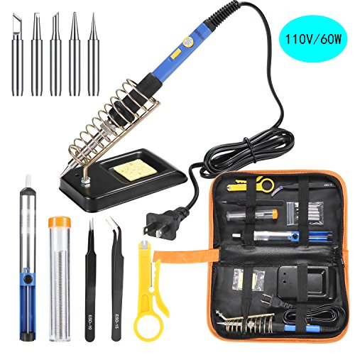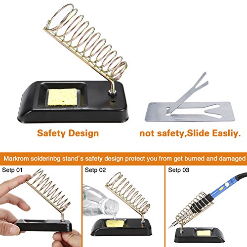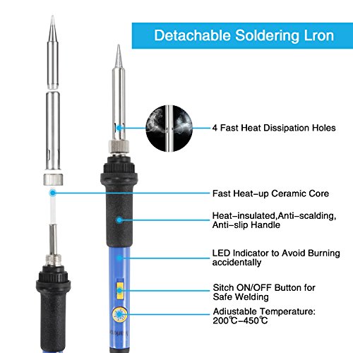- Multifunctional Soldering Highliths--- The household soldering iron designed with a temperature switch from 200 to 450°C ( 392-842℉ ), and ON/OFF switch, LED indicator light, 110V 60W to fit most universal home soldering needs, equip a spring-loaded type hard stand with cleaning sponge for protect the workbench.