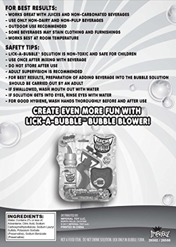ReleaseDate : 2017-11-30 Studio : Imperial Toy Publisher : Imperial Toy Binding : Toy Product Description In December of 2015, Lick-A-Bubble?was invented by a pediatrician, allergist/immunologist and physician scientist. Lick-A-Bubble?was created so that kids and adults of all ages can experiment?with different beverages to generate SAFE lickable bubbles.?From children’s birthday parties, events, and concerts, Lick-A-Bubble?is the ultimate experience for kids and adults of all ages!?Lick-A-Bubble?consumers?enjoy watching friends and family blowing and chasing trying to lick those bubbles.?Tease your taste buds with the most unique experiences bubbles have to offer.?Join the bubble mixologist nation and?Taste The Bubbles?with Lick-A-Bubble. 0