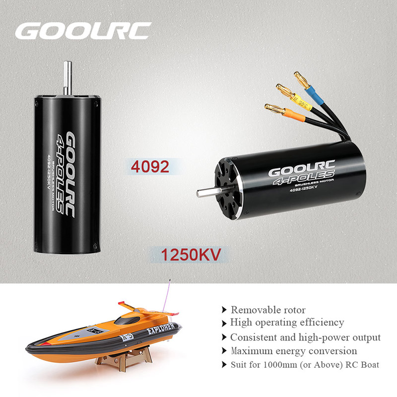 The original GoolRC 4092 1250KV 4 poles sensorless brushless motor is designed to provide both quality and performance at an affordable price. It is built from high quality aluminum alloy which is produced from the latest CNC milling machines, and is designed with high power and rotation speed to provide longer run time for 1000mm (or above) RC boat.