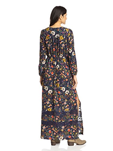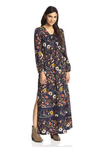 Hazel Women's Long Sleeve Printed Woven Maxi Dress with Lace Up Neck Tassels, Blue, Small