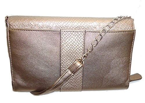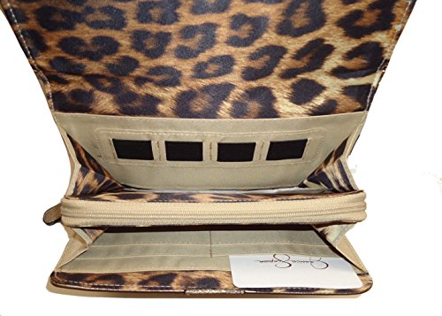 -. Feature : Size: Approximately 5.5 inches x 8.5 inches / Top button closure, Interior leopard lining / Interior zip around closure compartment; Rear large slip pocket / Multiple debit/credit card slots;Checkbook compartment / 25 percent metal chain strap; 75 percent faux leather strap