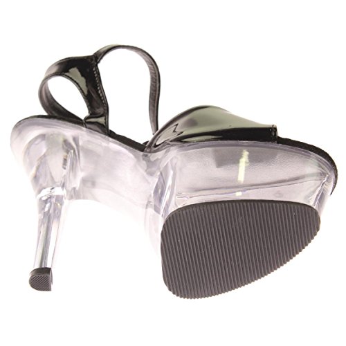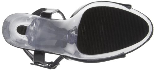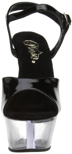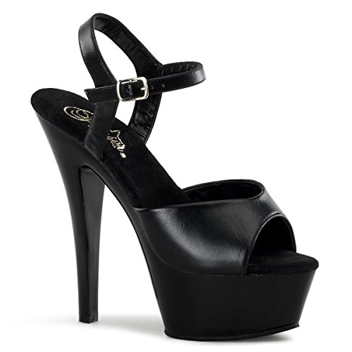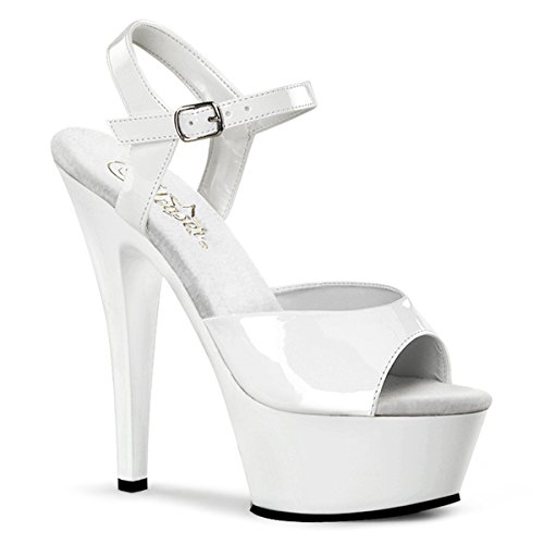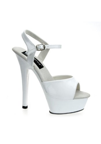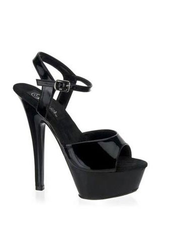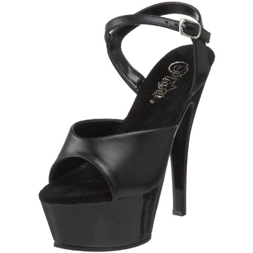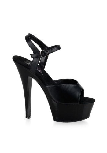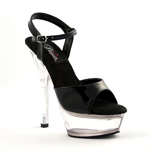 Amazon.com Slip into the Kiss sandal from Pleaser and you're clearly the sexiest one in the room. It features a glossy upper atop a formidable transparent platform and towering heel creating a decidedly provocative silhouette. A buckled ankle strap offers a secure fit. 0