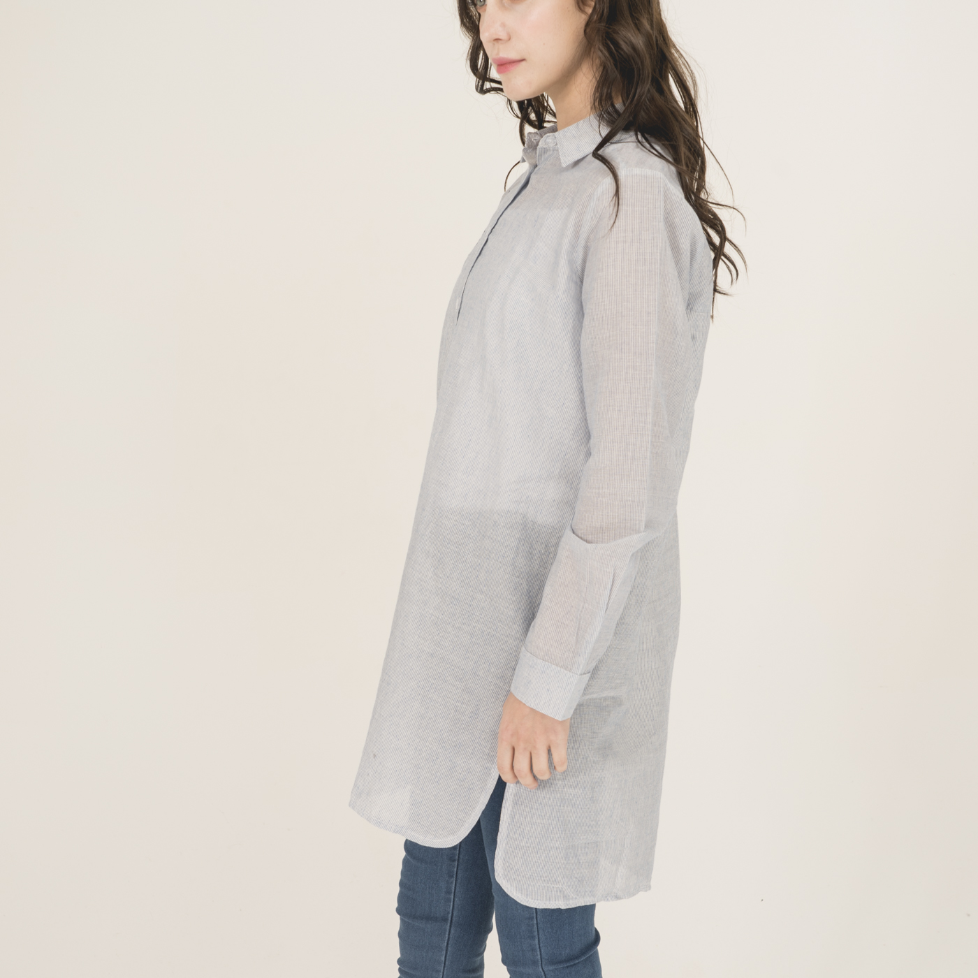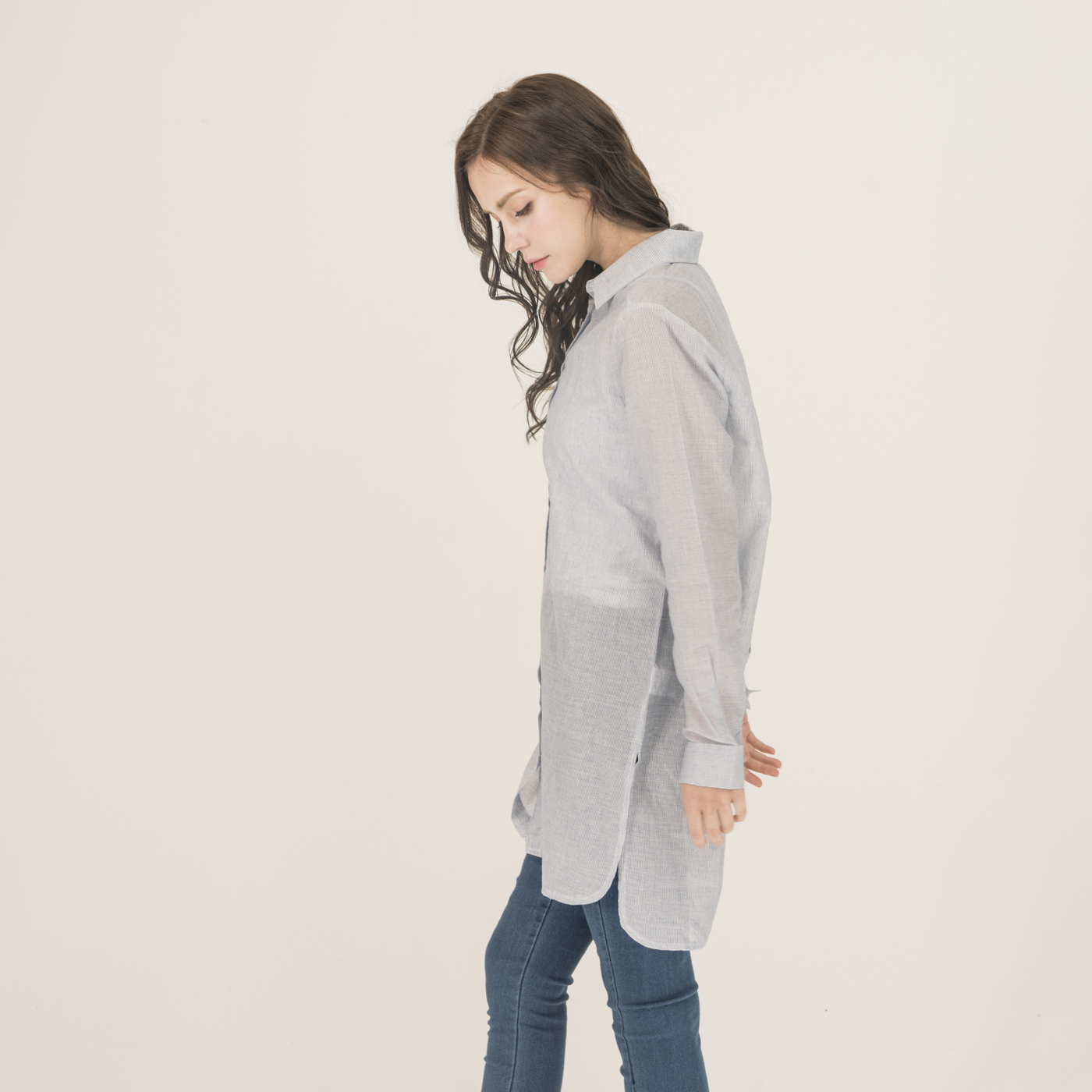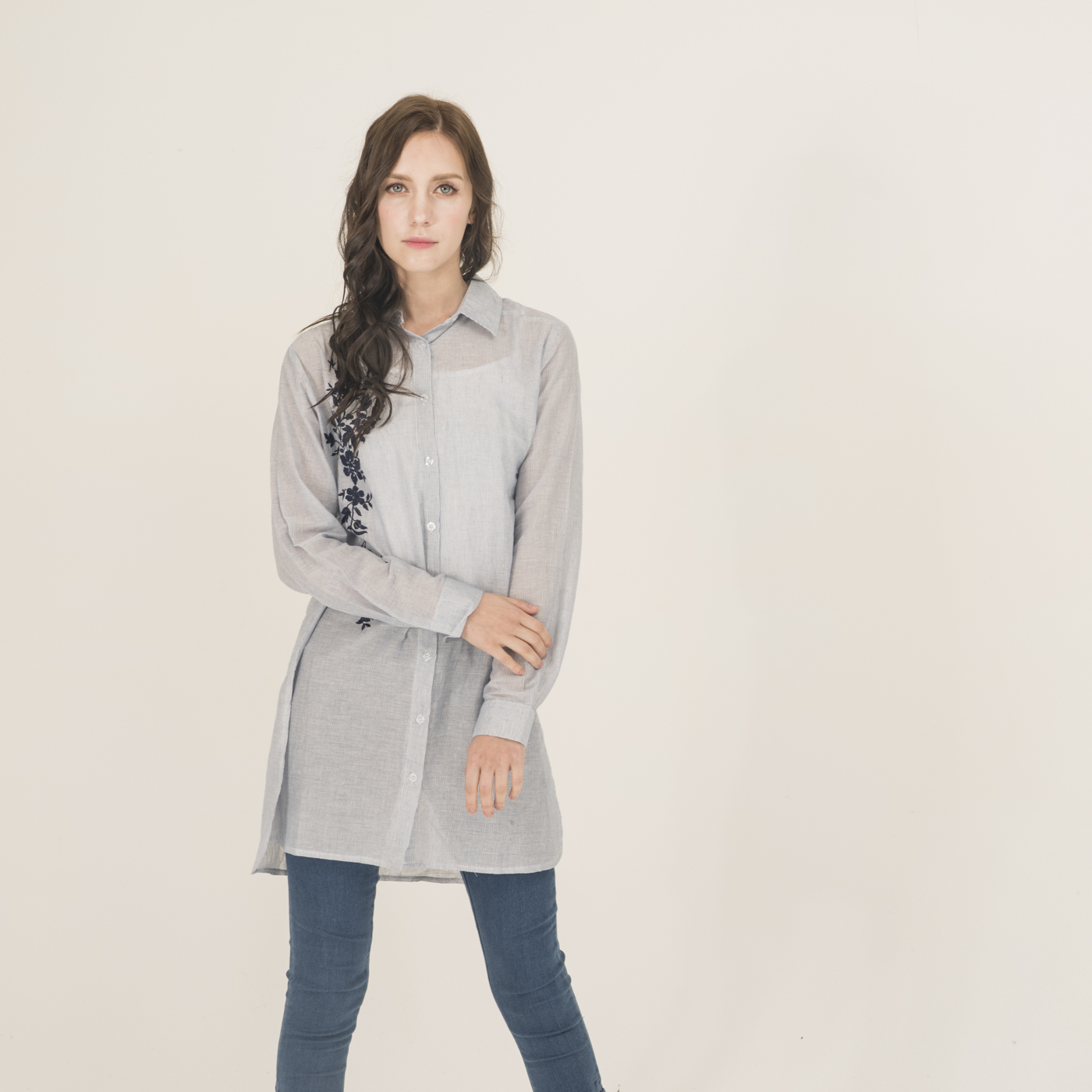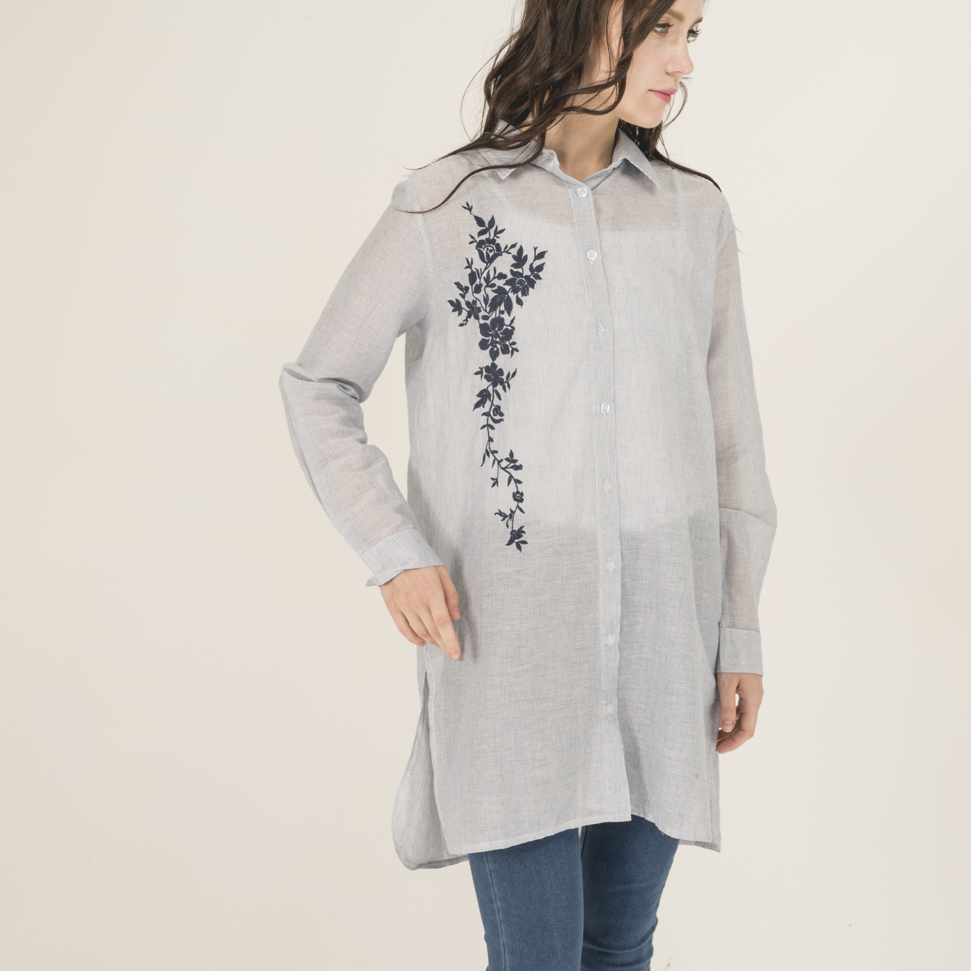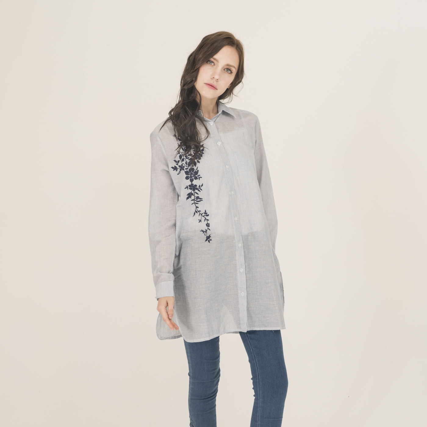 자수 포인트가 예쁘고 청량함이 있는 시원한 소재의 롱 셔츠입니다.