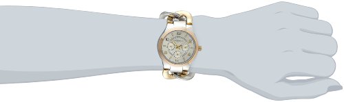 -. Feature : Multifunction features include day, date, and GMT (24 hour) sub dials / Gold-tone, Arabic numeral and baton, hour markers on the Silver-tone, sunray, dial / Gold-tone and Silver-tone twist chain bracelet and case with a Rose-tone bezel / Precise quartz multifunction movement / Water-resistant to 10 M (33 feet) / Round tri-tone dress watch with multi-link chain featuring silver-tone dial with gold-tone Arabic numeral and baton hour markers / Japanese-quartz movement with analog display / Protective mineral crystal dial window / Features jewelry-clasp closure / Not water resistant