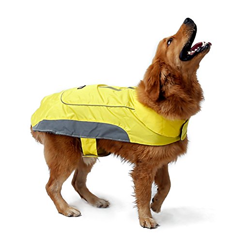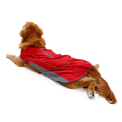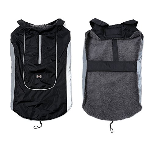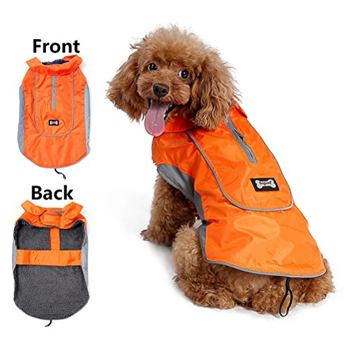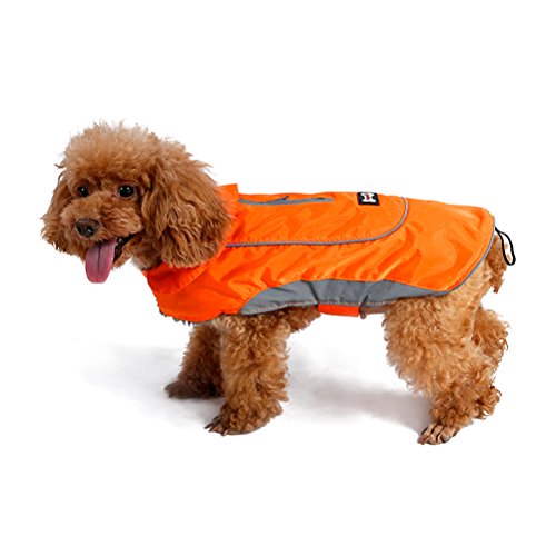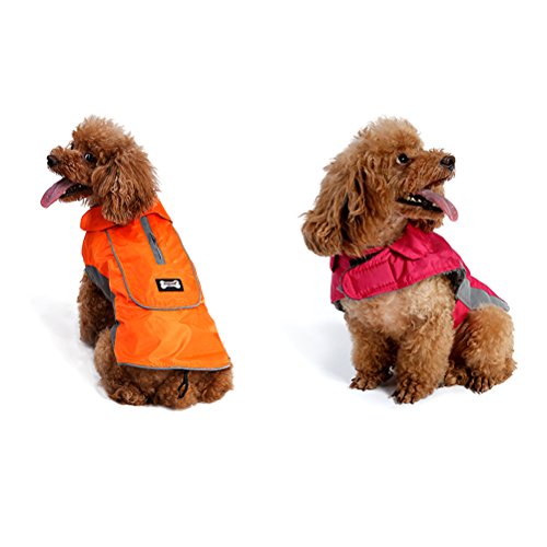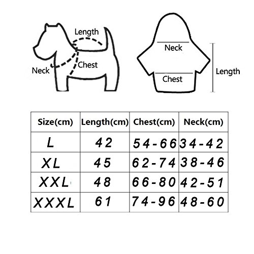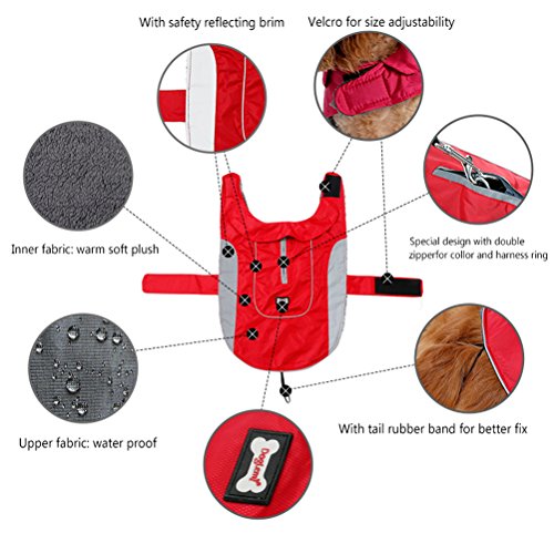 -. Feature : ❤Material:Warm cotton and waterproof polyester,100% warm and soft. / ❤elcro closure:Velcro for neck and chest,tail rubber brand for better fix,adjustable size for your dog.It is easy put on and take off. / ❤Well designed:safety reflecting brim and with double zipper for collar and harness ring,it is so easy to find your dog at night and the dog leash can be used. / ❤Occasion:6 bright beautiful color can be available,perfect for your dog in the cold winter and at happy festival. / ❤Notice:please measure your dog size according to picture in the left and choose a perfect jacket for your dog.