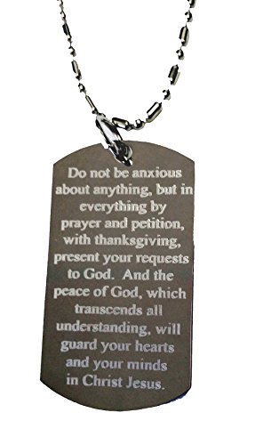 -. Binding : Misc. -. Feature : Stainless steel SILVER CHROME dog tag with design as shown / Includes 36" Metal Chain with clasp / 3D DIAMOND ENGRAVED - THIS IS A DOUBLE SIDED TAG / DOG TAG COLOR - High Polish Silver Chrome / Can be used as a Luggage Tag -. Label : DOG TAGS -. Manufacturer : DOG TAGS -. MPN : Dog-3109 -. PackageQuantity : 1 -. PartNumber : Dog-3109 -. ProductGroup : Pet Products -. ProductTypeName : PET_SUPPLIES -. Publisher : DOG TAGS -. Studio : DOG TAGS -. Title : Christian Jesus Christ Cross Philippians 4:6-7 Pendant Double Sided Logo - Military Dog Tag, Luggage Tag Metal Chain Necklace