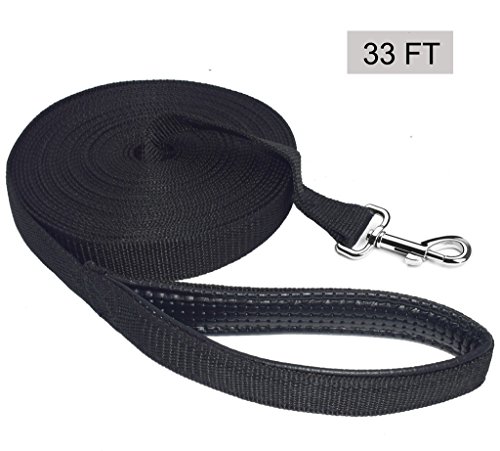 33-feet dog leash, Perfectmade multiple-use long nylon training lead leash with friction reducing leather padded handle/loop this extra long nylon dog/pet rope leash is specially designed for recall training, teaching, outdoor playing freedom, hiking, camping, swimming, off-leash simulation.