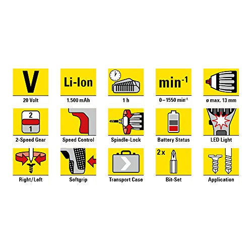 -. Feature : 20 V starker Lithium-Ionen-Akku ohne Memory-Effekt und ohne Selbstentladung sowie einem kraftvoller Motor mit 2-Gang-Getriebe / 25 Drehmomenteinstellungen plus Bohrstufe / Schnellspannbohrfutter mit automatischer Spindelarretierung / Stufenlose Drehzahlsteuerung mit Quickstop / Eingebaute LED-Arbeitsleuchte / Schnell-Ladegerät: Nur 1 Stunde Ladezeit / Dreistufige beleuchtete Ladezustandsanzeige des Lithium-Ionen-Akkus / Gummierte Softgrip-Einlagen im Gehäuse für extra guten Halt / Bequeme Rechts-Links-Laufumschaltung und Einschaltsperre