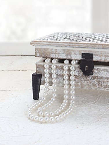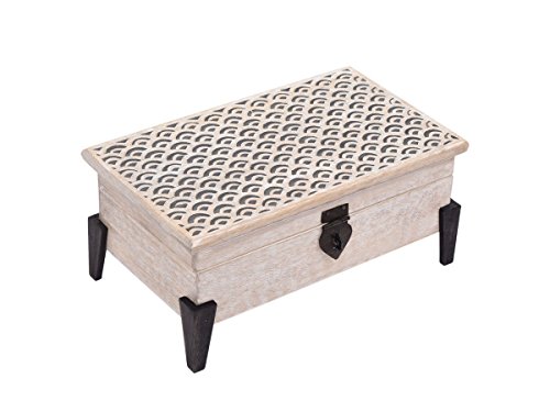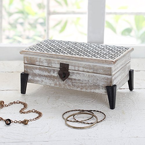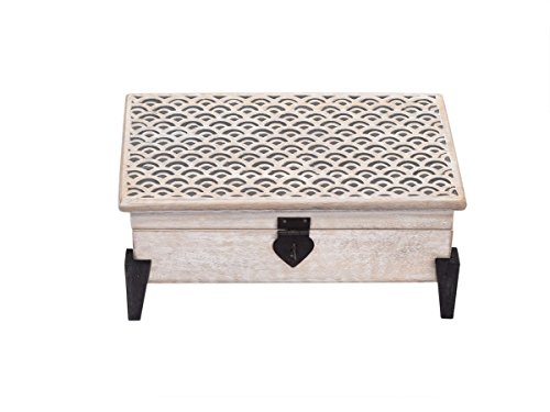 -. Feature : Dimensions: Length - 9 Inches x Width - 5 Inches x Height - 3 Inches / Handcrafted from mango wood, this jewelry box comes fashioned with intricate cutwork and a knob. It has burnt wooden legs that add to its overall aesthetics. This box has contemporary legs in black color which complements the white distressed box beautifully. / The natural wood finish lends an artistic touch to your dressing table/ desk/ console table/ night stand. / It makes for an ideal jewelry box, cosmetic box, collectibles/ trinket box and an organizer for your favorite keepsakes. / Made in Saharanpur, the handicraft hub of India - world famous for all and any kinds of high quality wood and iron ware By purchasing this product from Store Indya, you will help sustain the 1,000 year traditions of handmade artistry of ethnic artisans living off the heartland of India, as we will donate 10% of our profits to train a new generation of artisans with modern techniques of craftsmanship.