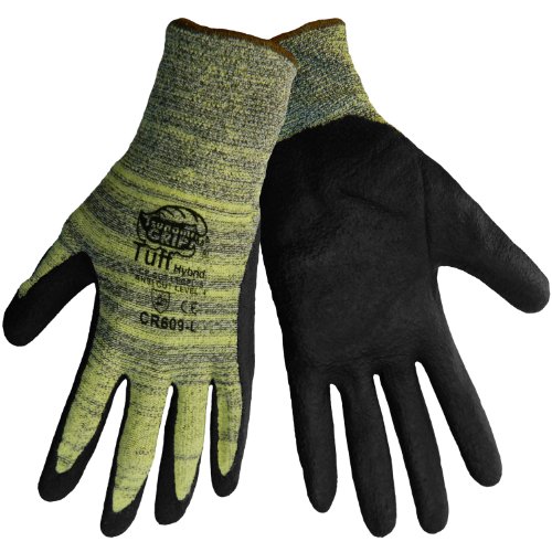Studio : Global Glove Publisher : Global Glove Binding : Misc. Product Description Global Glove the Tsunami grip tuff hybrid CR609 is a 13-gauge seamless knit glove that represents the latest development in high performance, cut-resistant fiber technology. The superior cut protection comes from an engineered yarn using a propriety wrapping process. Aralene is a kevlar fiber with space age strength enhancement combined to give a European EN 388 level 5 cut resistance. High dexterity 13-gauge glove, with 1525 grams on American ASTM F-1790 for American level 4. The Hybrid also uses the propriety two step nitrile that gives grip similar to foam/air injected nitrile but will not saturate through the coating. General purpose gloves. Liner color: yellow and black. Coating color: black. Coating composition: nitrile palm. Cuff finish: elasticized knitwrist. Kevlar and high strength fiberglass liner provides excellent cut resistance and dexterity. Black hides soil, extending glove wear life. Ergonomically designed forms provide naturally curved, relaxed fit to reduce hand fatigue Tsunami Grip Tuff- two step nitrile provides good wet and dry grip. Applications: assembly involving small sharp components, automotive, white goods, plastics, glass. Small size. 0