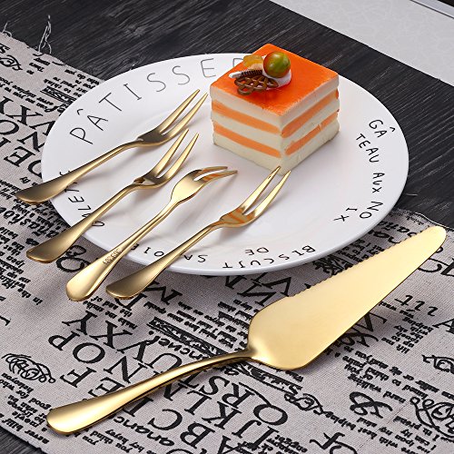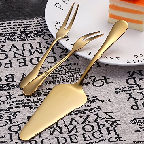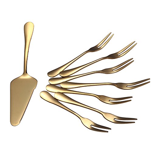 Buyer Star 1 Pcs Cake Server 7 Pcs Forks, Gold 9-Inch Pie Cake Cheese Metal Cutter Shovel Slicer, Fruit cake salad Forks Set, 18/10 Stainless Steel