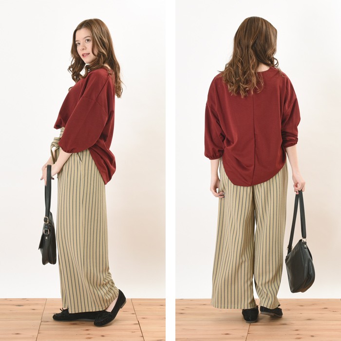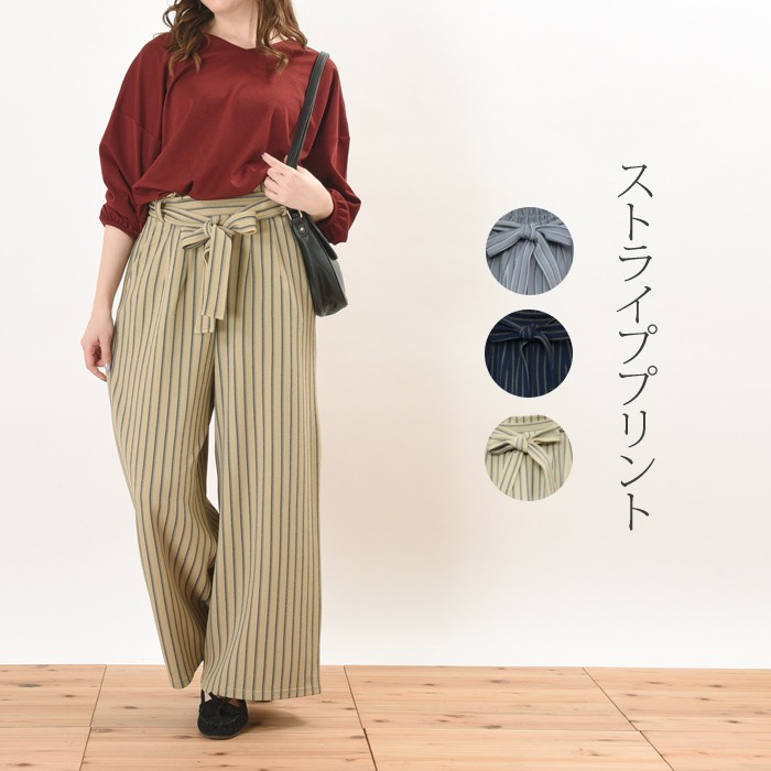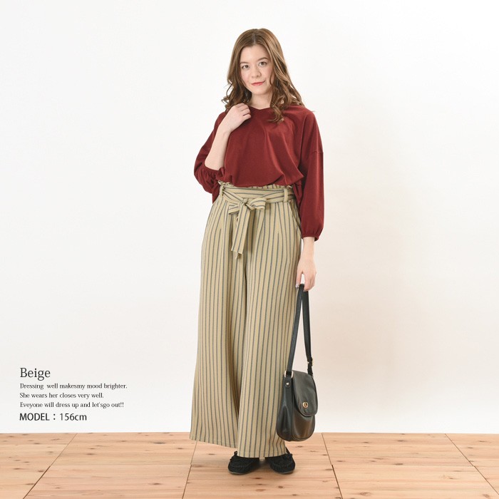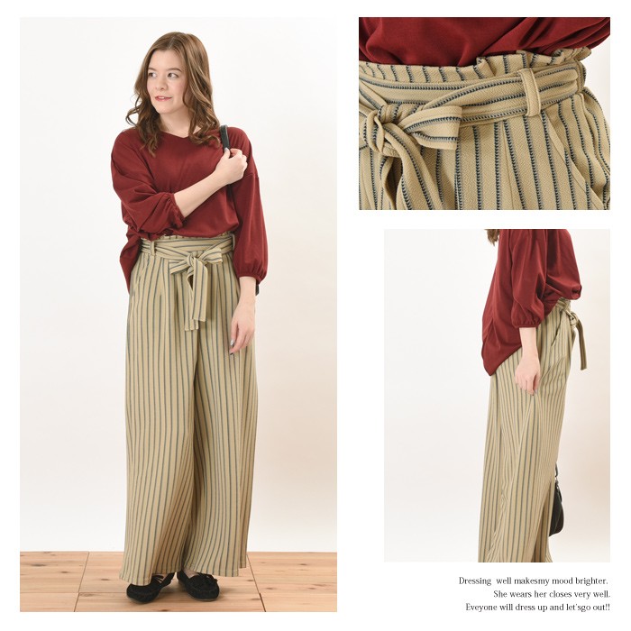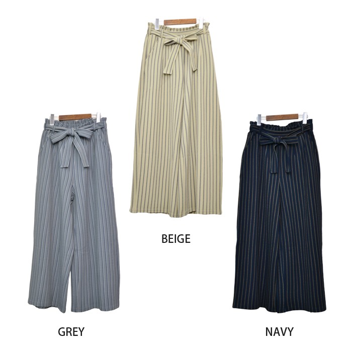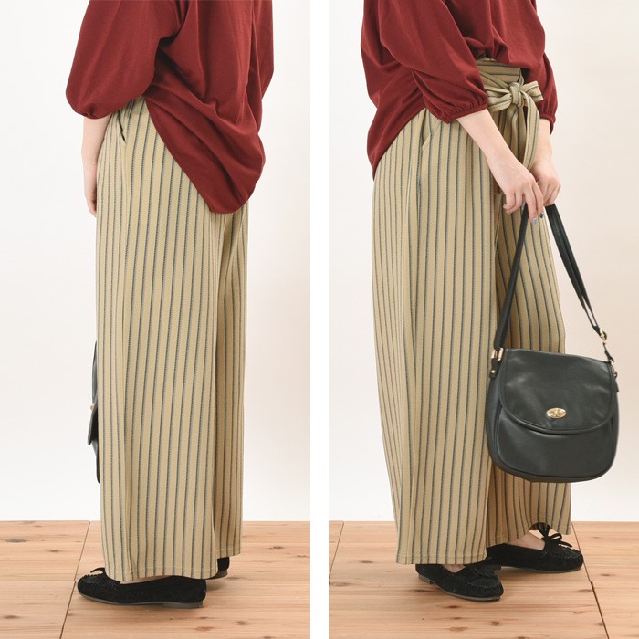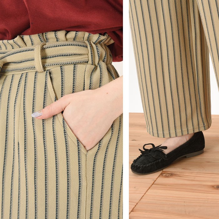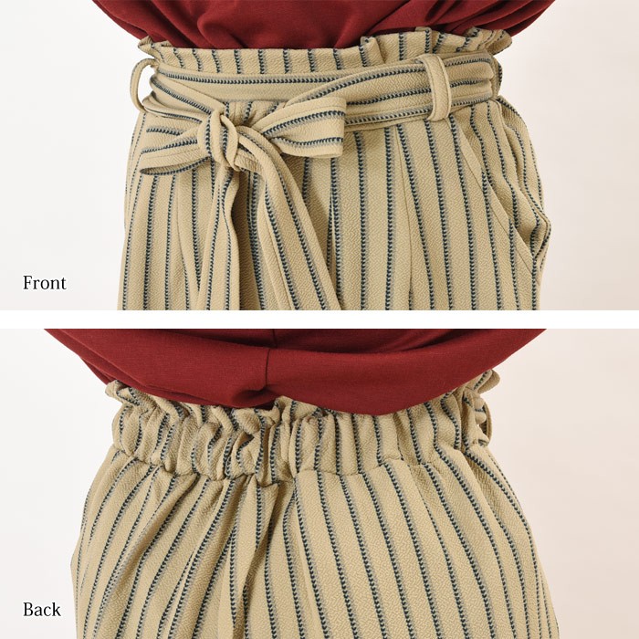 立体的な生地感で、ふっくらとオシャレな雰囲気のふくれジャガード生地のガウチョパンツです。シンプルで着回しやすいストライプ柄なので、コーディネートに取り入れやすく幅広く着まわせます♪ウエスト部分はゴムが入っているので、着心地楽ちんでワードローブにお使いいただけます。立体感のある素材でオシャレな雰囲気なので、シンプルなトップスやアウターと相性抜群です♪ウエスト部分には、ポイントになるリボン付きです♪Mサイズ Lサイズ