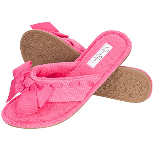 -. Binding : Apparel -. Brand : Jessica Simpson -. Department : womens -. Feature : SIZING: Available in size Small (US 5 -6), Medium (US 7 - 8), Large (US 9-10). / ANTI SLIP SOLE: The textured floral print bottom grips to the floor preventing you from sliding or slipping. / STYLE: Thong slipper with ribbon bow design. Plush, thick cloud-like cushion provides ultimate comfort. Available in black and pink / fuchsia. / CARE: Hand wash with cold water. Air dry and dry flat. -. ProductGroup : Shoes -. ProductTypeName : SHOES -. Title : Jessica Simpson Slip On Thong Slippers, Women's Indoor Shoe With Bow