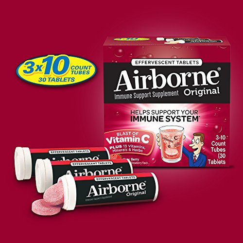 ReleaseDate : 2017-05-01 Studio : Reckitt Benckiser Publisher : Reckitt Benckiser Binding : Health and Beauty Product Description Airborne Effervescent Tablets provide real immune support in a great-tasting and fast absorbing formula. Each serving (1 tablet) delivers a blast of 1000 mg of Vitamin C plus 13 other immune system supporting vitamins, minerals, and herbs, including Echinacea, ginger, and other herbal extracts from whole plant materials. Adults and Children over 12 years old, simply drop 1 tablet in a glass of water or favorite beverage, let dissolve (about 1 minute) and drink. Can repeat every 3-4 hours as necessary. Take up to 3X per day as needed. Gluten Free and No Preservatives. Visit AirborneHealth.com to learn more. These Statements have not been evaluated by the Food and Drug Administration. This product is not intended to diagnose, treat, cure or prevent any disease. 0
