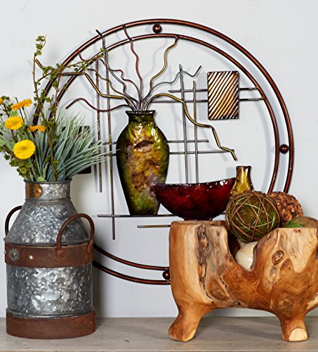 24 inch updated traditional textured red and brown patina metal vase still life wall sculpture mounted onto open design geometric and circular iron frame. This product is made in China.