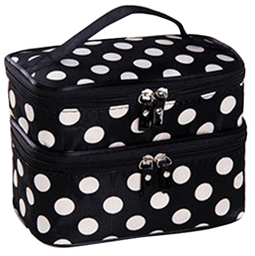 JOVANA Double Layer Cosmetic Bag Black with White Dot Travel Toiletry Cosmetic Makeup Bag Organizer With Mirror