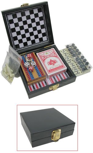 Studio : CSE Publisher : CSE Binding : Toy Product Description PEOPLE-POWERED GAMES WARNING: CHOKING HAZARD-Small Parts. Not For children under 3yrs. No electricity, no batteries, no problem. This 6-game set comes in a lovely 5" square padded genuine faux pleatherette case, and includes a mini chess/checker board in one lid and a backgammon board in the other. Inside is a small deck of cards, a 28-tile double-six domino set, magnetic chess and checkers pieces, and a cute little cribbage board with pegs. Perfect for the car, airplane, lake house or post-apocalypse bunker. 0