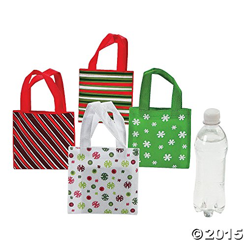 12 Christmas MINI TOTE BAGS/Holiday PARTY FAVOR/Gift/Colorful Designs/6" X 6" POLYESTER