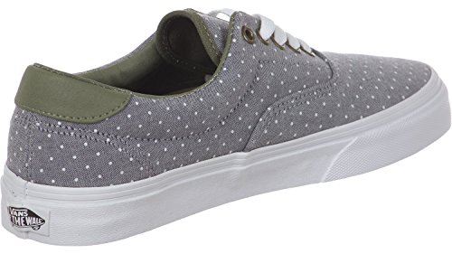 The Chambray Dots Era 59, a low top lace-up skate shoe has a durable double-stitched chambray upper with all-over polka dots.
