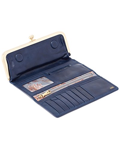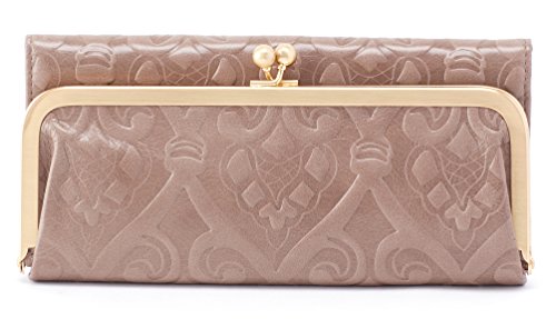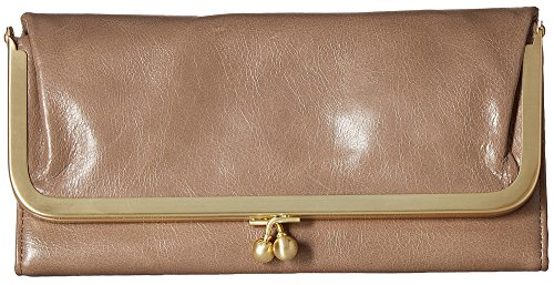 Superbly mixing class and function, this beautiful Rachel Clutch Wallet by Hobo transitions perfectly from day to night! Hobo is all about making stylish yet purposeful women's leather accessories and this wallet is no different. This clutch is made from top-grain leather which has been extra tumbled for a unique, broken-in vintage look and shine. This fully lined clutch has a large exterior pocket with a brushed finish metal kiss lock closure. The interior features 8 card slots, 3 currency pockets, 1 clear ID window, 1 zippered coin pocket, and a slip pocket with a cosmetic mirror. Show off your vintage style with this gorgeous clutch! Measures 8.25" x 3.75" x 1.5", folds out to 11.25" wide.Feature