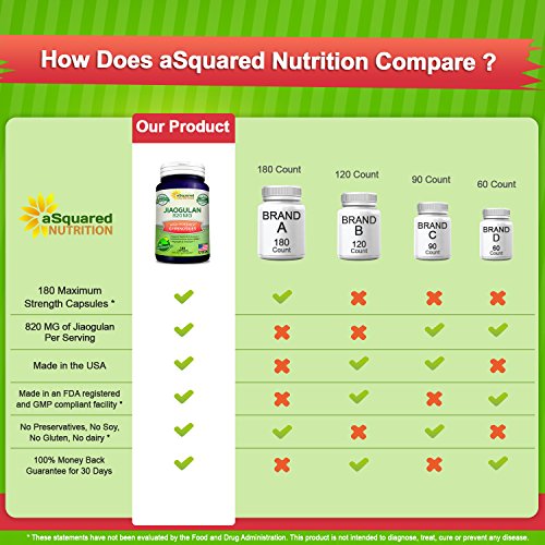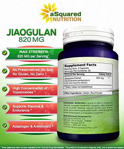 NATURAL & MADE IN THE USA: aSquared Nutrition’s Jiaogulan supplement contains 820mg of Jiaogulan root and rhizome extract per serving (2 capsules). Our natural herbal formula is made from pure Jiaogulan, is Caffeine free, and contains high potency Gypenosides. It does NOT contain preservatives, soy, gluten, dairy or extraneous fillers. Our potent complex is made in the USA, in an FDA registered and GMP compliant facility. Our products go through rigorous testing to ensure quality & purity. *