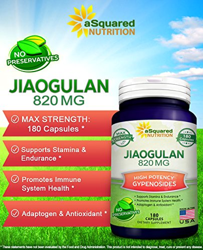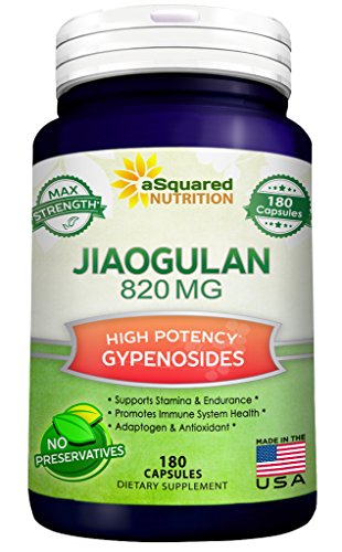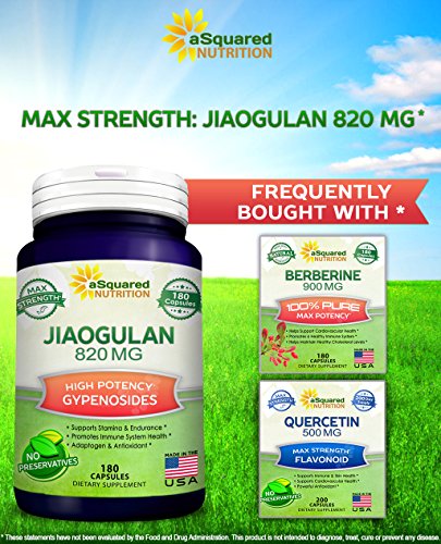 MAX STRENGTH JIAOGULAN EXTRACT: aSquared Nutrition’s maximum strength Jiaogulan extract contains 820mg of pure Jiaogulan extract per serving. With 180 capsules in every bottle, you receive a full 90 day supply. Jiaogulan, also known as Gynostemma pentaphyllum, is a climbing vine indigenous to Japan, Vietnam, Southern Korea, and China. Jiaogulan is thought to have powerful antioxidant & adaptogenic properties, and is often taken with Quercetin, Berberine, or even Panax Ginseng 1000mg. *