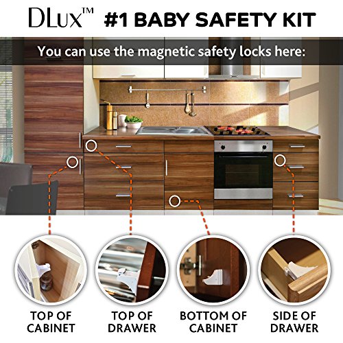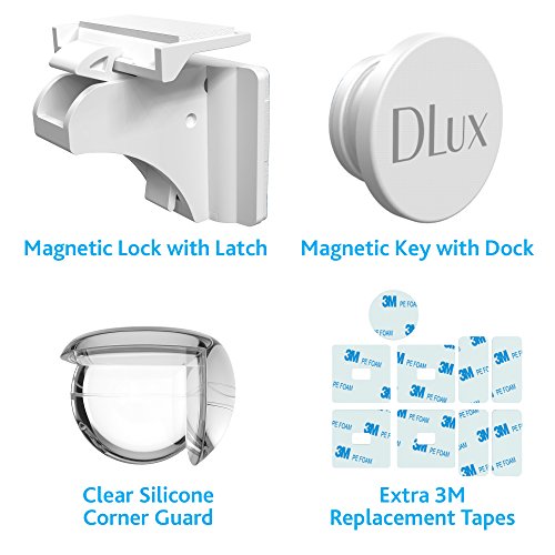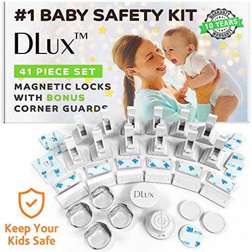 Dlux Magnetic Cabinet Locks for Child Safety [12 Locks & Latches, 2 Magnetic Keys, 4 Corner Guards Kit] Baby Proof Kitchen Drawers and Doors, No Drill Required, 41 Piece Set
