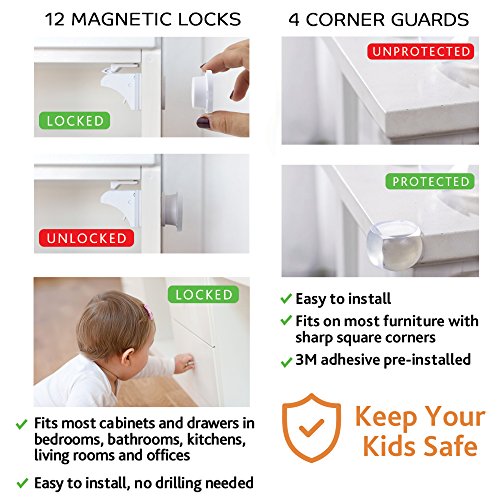 LAUNCH SALE - Was 27.75$, Now SPECIAL LAUNCH PRICE for a limited time - AMAZING VALUE - 41 piece set is perfect for childproofing in your kitchen or other areas of your home. Includes 12 magnetic locks and latches, 2 magnetic keys and docks, 9 replacement tapes and 4 corner guards.