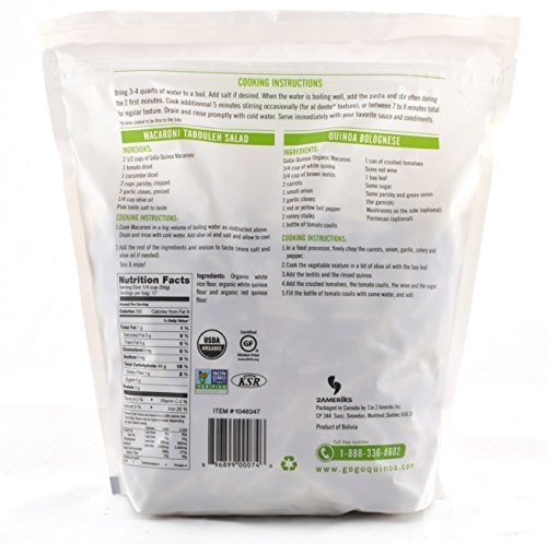 -. Feature : (1) 2.2 Pound Resealable bag of Red & White Quinoa Macaroni / Made with Red & White Quinoa / Offers the same lovely 'al dente' texture as wheat pasta. / Organic, Gluten Free, Non-GMO / Cooks in 5-9 minutes