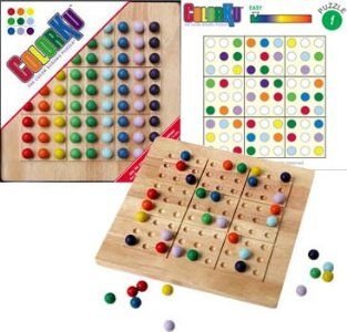 -. Feature : To solve the puzzles, Colorku uses brightly colored wooden balls / Includes 81 balls in 9 different colors, 104 puzzle cards / 5 Levels of difficulty / For ages 8 and up