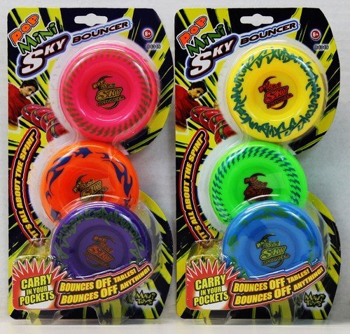 Studio : Maui Toys Publisher : Maui Toys Binding : Misc. Product Description MAUI TOUS - POP MINI SKY BOUNCER - 3-PACK - ASSORTMENT. Kids ages: 6 ears old and up will love playing with these Sky Bounce toys in a mini size. They fit right in kids pockets, to carry where ever they want. "Bounces off Tables! ... Bounces off Anything!" Awesome fun for all! Come in an assortment of 3 packs of 6 different colors. Each carton contains: 2 of each set. (Subject to change). UPC: 039897843490 0