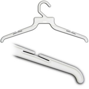 -. Feature : 16'' Wide / These light weight multi-purpose white plastic hangers include strap hooks. / It is economical enough to give away. / Sold in packs of 500 pcs.