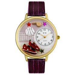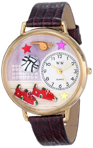 Amazon.com The perfect timepiece for volleyball fans, Whimsical Watches' Volleyball Watch for Women is a quirky, unique piece of art for your wrist. This fun-loving timepiece features handcrafted volleyball-themed miniatures that have been carefully placed under the domed crystal. Other highlights of the watch include an analog dial with Arabic hourly indexes, a gold-tone stainless steel case and bezel, and a textured purple leather band with buckle closure. This unique watch is water resistant to 100 feet (30 M) and features Japanese-quartz movement. 0