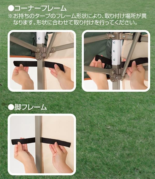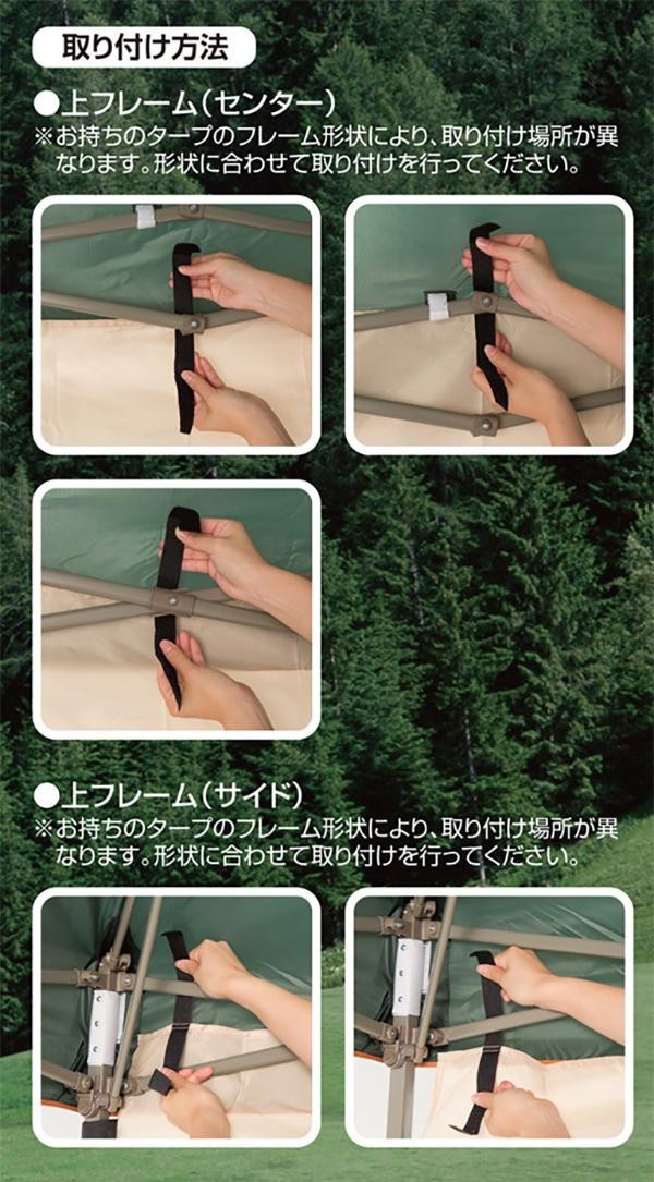 | お持ちのタープに取り付ける事で居住性をさらにUP!!遮光と風通しを両立させた快適タープサイドウォール。上面はポリエステル素材で、本体を動かすことで日の当たり具合を調整できます。下面はメッシュ構造で風通し抜群です!! |