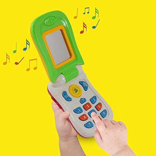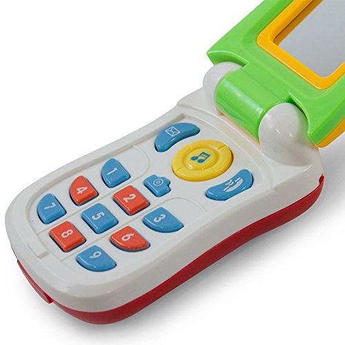 PHONE FEATURES -Palm size flip phone with playful features. Press the soft buttons and you'll hear some fun melodies and lighting. Flip open the phone and see yourself in the mirror and a surprise picture too. Your little one will be engaged from this fun phone.