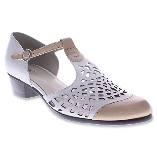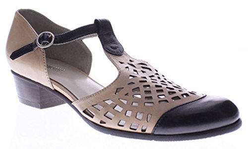Highest quality leather upper. Hand crafted two tone, t-strap pump with beautiful laser cut out design. Thickly padded comfort insole. TPR outsole with a modest heel. Heel Height: 1 1/4". Platform Height: 1/4".