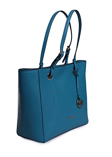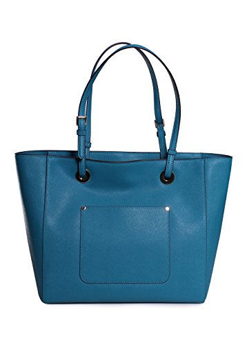 -. Feature : Color/material: peacock leather / Exterior design details: gold-tone hardware, exterior pocket, removable charm / Interior design details: fabric lining, interior pockets / Measures 17.5in wide x 11.75in high x 6in deep / Top handles drop 10in