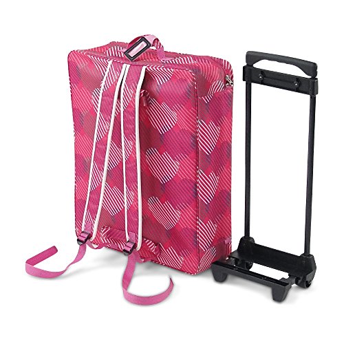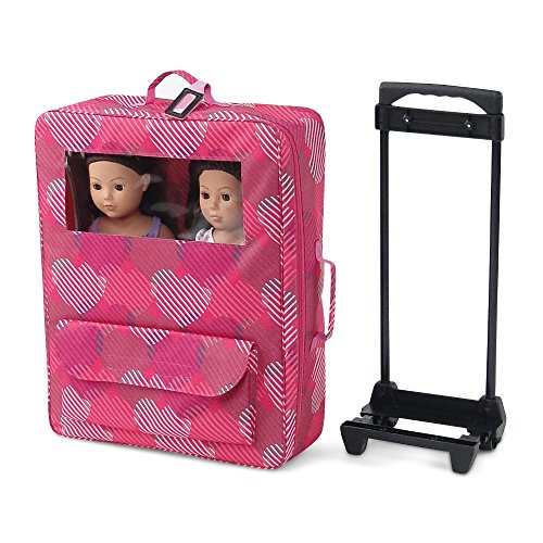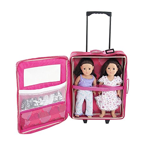Your 18" dolls can travel anywhere and sleep in comfort with this complete travel / doll carrier luggage set, made to fit 2 dolls perfectly! The durable pink travel case has a perfect window to display both of your dolls and includes 2 straps, one to secure your dolls in the bed and one to secure the bed in the case, along with multiple compartments to store extra clothes and accessories. The carrier is designed with a removable wheeled trolley and backpack straps to provide several comfortable ways to transport your doll. When you reach your destination, a cute pink doll bed and matching bedding (pillow and blanket) can be removed to provide a restful place for your 2 dolls to spend the night! *Doll Not Included*Feature