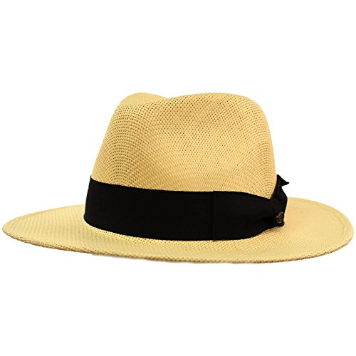 Men's Summer Cool Light Weight Wide 2-3/4" Brim Structured Flat Brim Pleated Solid Black Ribbon Bow Hatband Retro Derby Fedora Trilby Cap Hat Spring Summer Light Weight Premium Structured Panama Wide Brim Medium Hard Body, Flat Brim Resort Wear Sun Hat with interior sweat band, no lining for cool comfort. Grosgrain striped pattern ribbon bow hatband. Redesigned for cool fit. Keep the harmful UV rays out of your face. Perfect for hot and warm weather outdoor activities, will keep you cool. Will compliment any outfit. How about for vacation or for resort wear. 0 |