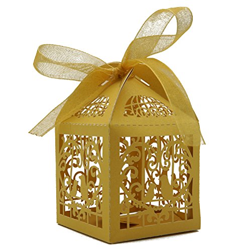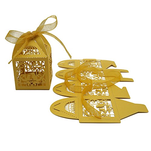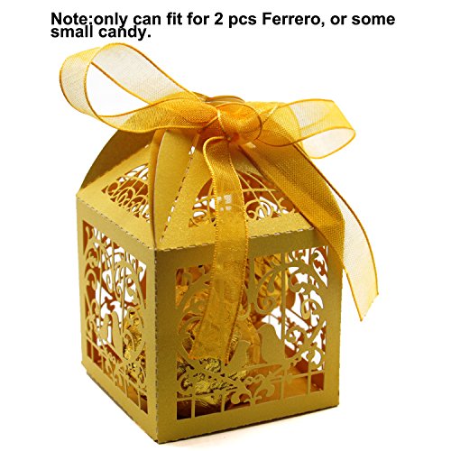 KEIVA 70 Pack White Love Birds Laser Cut Favor Candy Box Bomboniere Decorations Gift Boxes with Ribbons Bridal Shower Wedding Party Favors (Gold)